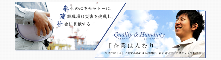 〜企業は人なり〜 奉仕の心をモットーに、奉建社は人に関するあらゆる課題に質の高いサービスに応えます。 奉建社は、埼玉県越谷市や東京都内など関東エリアで、配管工事、空調・衛生等設備施工管理から設備付帯工事 全般、建物クリーニングや各種メンテナンスまで、様々な施工案件を取扱っております。 奉仕の心をモットーに、有資格者多数の優れたスタッフが質の高いサービスを提供いたします。