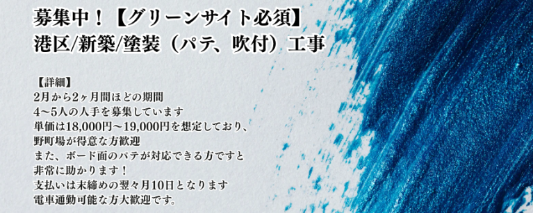 初めまして 偕盛株式会社と申します。 弊社では、墨田区を拠点に下記工事を行なっております。 【事業内容】 塗装工事 【必須項目】 グリーンサイト CCUS 上記は必須となりますので問題なく対応いただける 方ですとスムーズにお願いができるかと思います。 現在弊社では事業拡大に伴い新たに協力業社様と繋がりたいと考えております。 協力会社や個人事業主様を積極的に募集しています。 これから末長くご協力いただけるパートナーとして、関わっていただけると幸いです。 どうぞ、よろしくお願いいたします。 スポットだけでなく、長期的にお付き合いができる方募集です。 ご連絡お待ちしております。