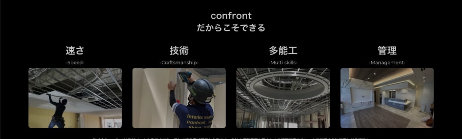 | 得意なこと | 株式会社confrotは デザインから施工までを一貫して行う事が可能な企業です。 自社の経験豊富な職人により軽天工事を主に、 大工工事や金物工事など多能工かつ対応スピードも速く施工する事や、 自社の徹底した現場管理により可能な限り工期に合わせた施工を行う事が可能です。 お客様の想いを形にするデザインと職人の幅広い技術力。 店舗や施設などあらゆる内装工事に対して対応可能なのが弊社の強みです。 |